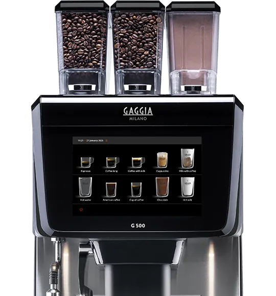 G500 Latte Velluto er en premium kaffemaskin for bedrifter som ønsker høy kapasitet, brukervennlig betjening og førsteklasses kaffe i hver kopp. Maskinen kombinerer hele bønner, 10-tommers touchskjerm og Latte Velluto-teknologi for å levere et bredt utvalg kaffedrikker med fyldig melkeskum og jevn kvalitet.